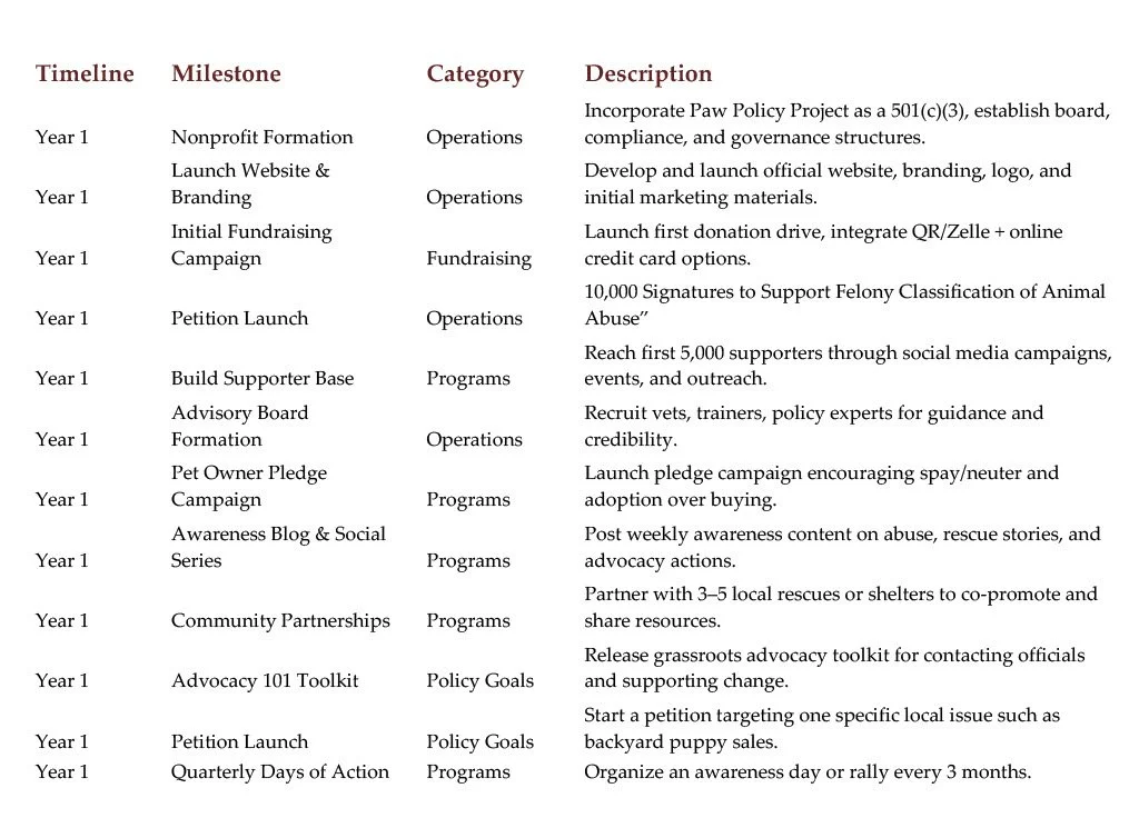 At Paw Policy Project, we know change doesn’t wait. That’s why our first year is all about momentum: building support, raising awareness, and taking action that sets the stage for long-term reform.